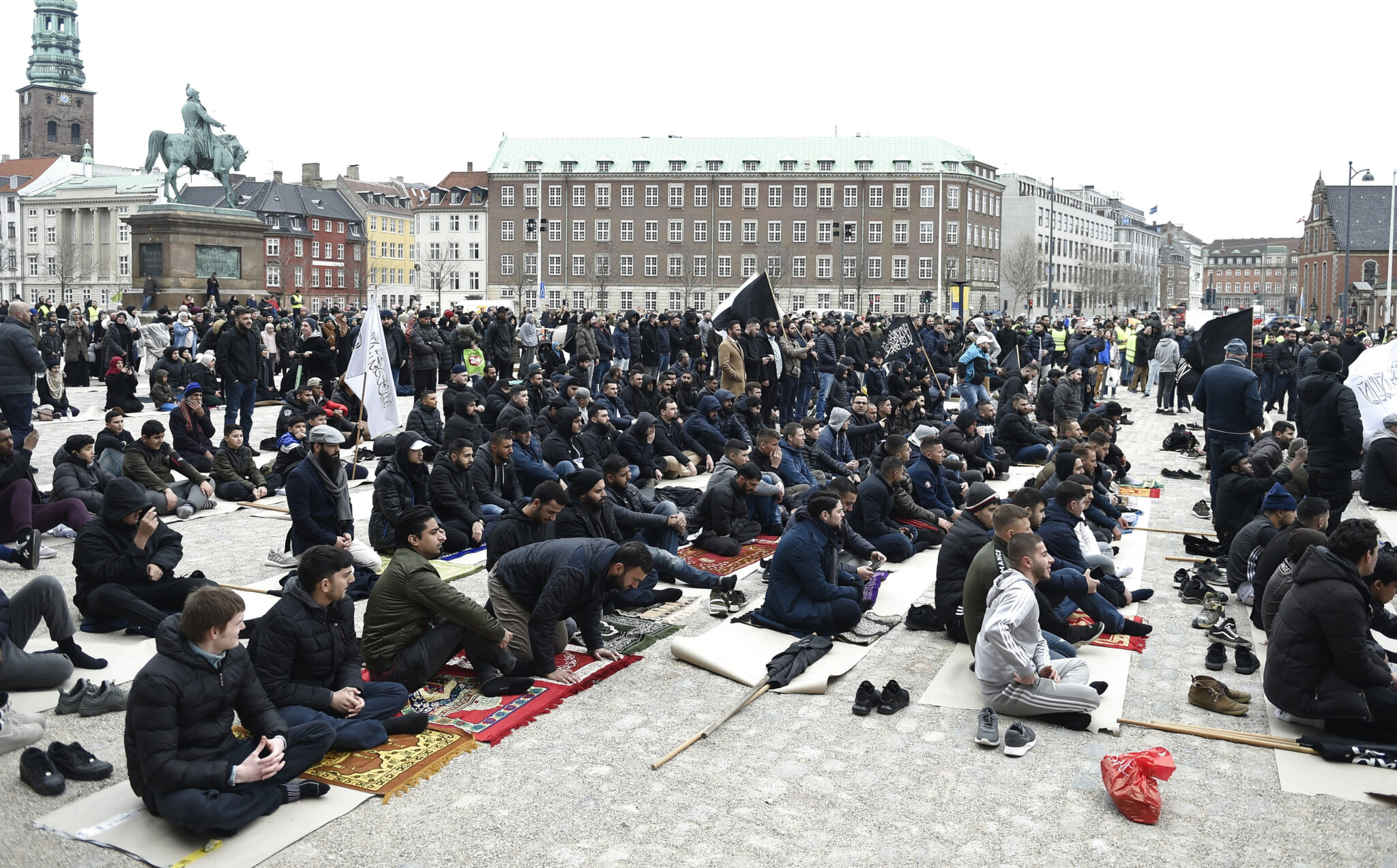 Folk deltar i fredagsbønnen på Christiansborg Slotsplads i København den 22. mars 2019. Fredagsbønnen er til støtte for de 50 muslimene som for en uke siden ble drept av en bevæpnet mann på New Zealand. Foto: Liselotte Sabroe / Scanpix via AP / NTB.