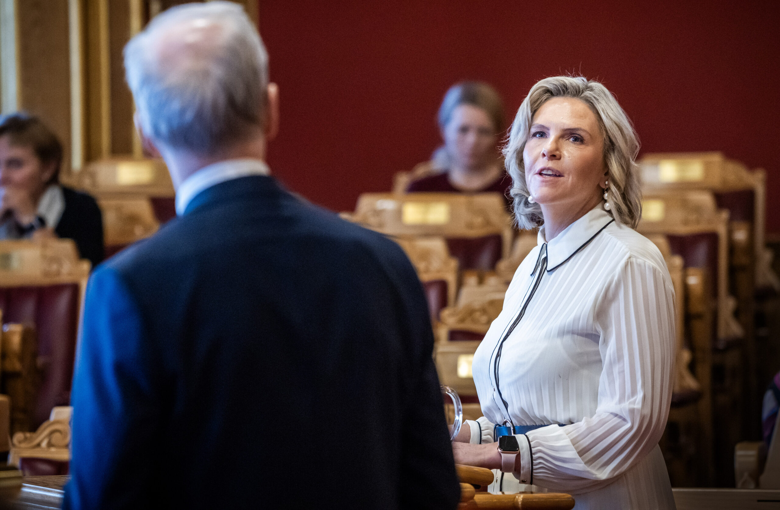 Sylvi Listhaug (FrP) stiller spørsmål til statsminister Jonas Gahr Støre under en debatt i Stortinget den 6. februar 2025. Foto: Ole Berg-Rusten / NTB