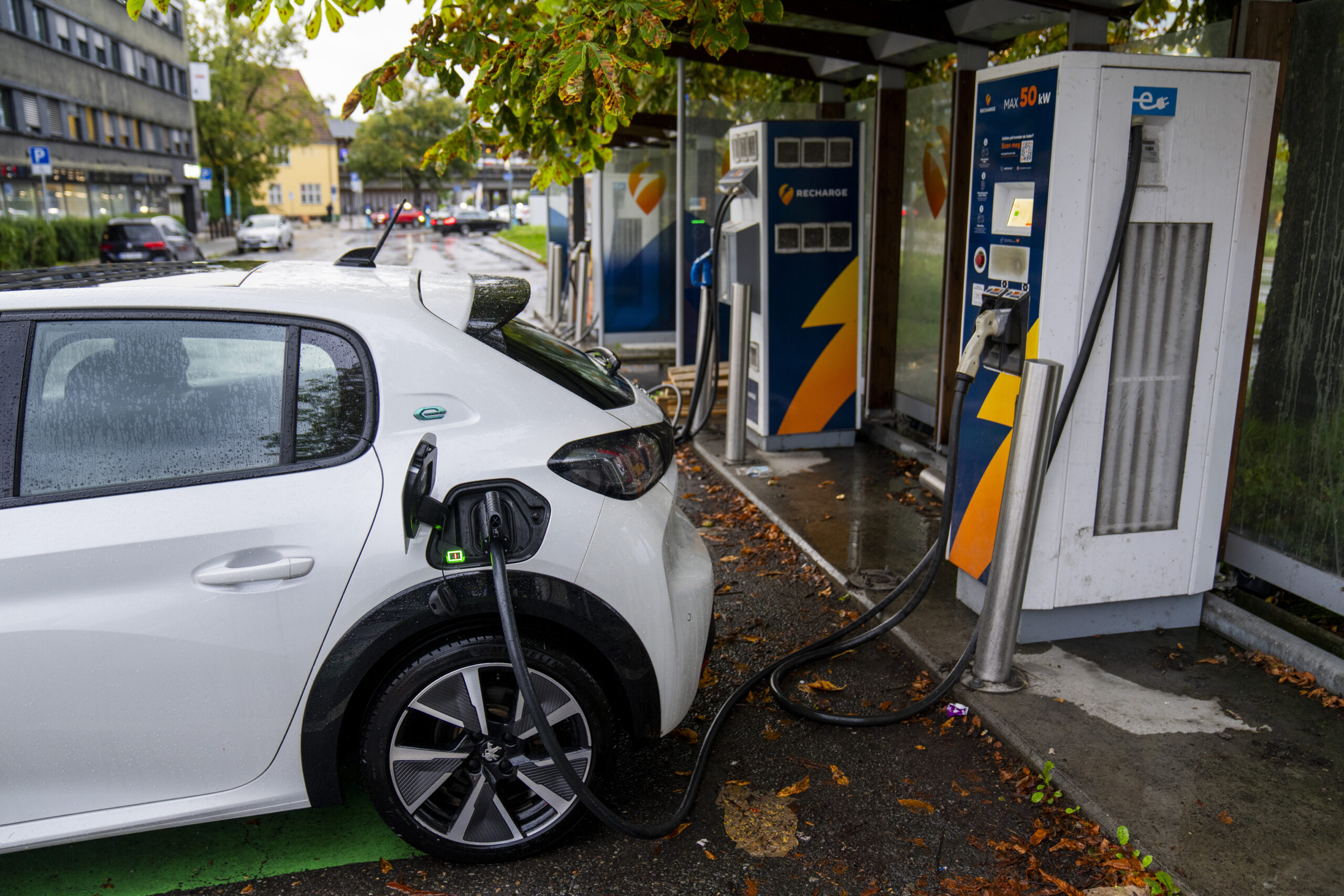 Hurtiglading av elbil ved Recharges lade­stasjon på Skøyen i Oslo den 2. september 2024. Foto: Fredrik Varfjell / NTB.
