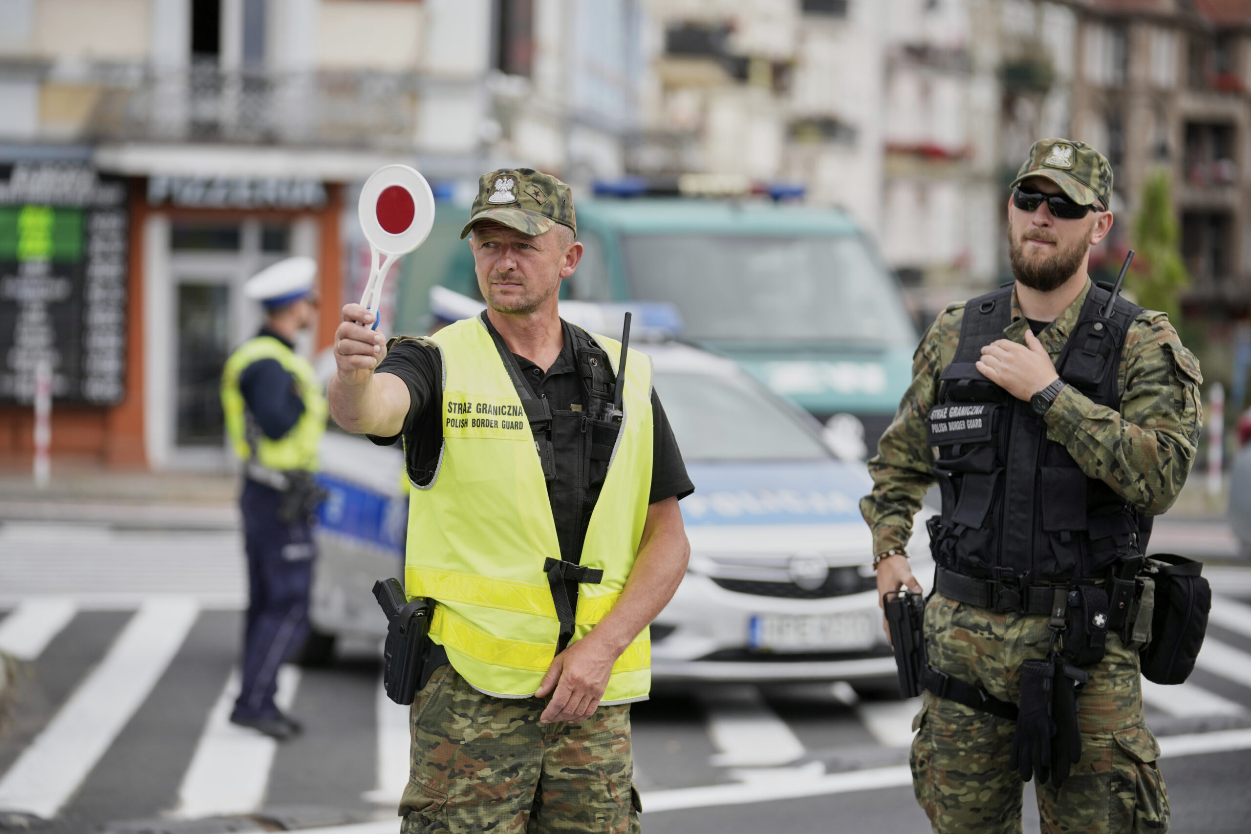 Polsk grensepoliti kontrollerer kjøretøyer på en grenseovergang mot Tyskland ved Slubice den 7. juli 2025. Foto: Ebrahim Noroozi / AP / NTB.
