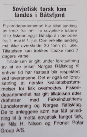 50 år etter at forbudet mot landing av trålfisk ble besluttet av Stortinget, fikk de to første sovjetiske trålerne våren 1988 levere torsk i Båtsfjord. Det mest hellige dogmet var falt, men trålerhatet lever videre. Faksimile fra Fiskets Gang.