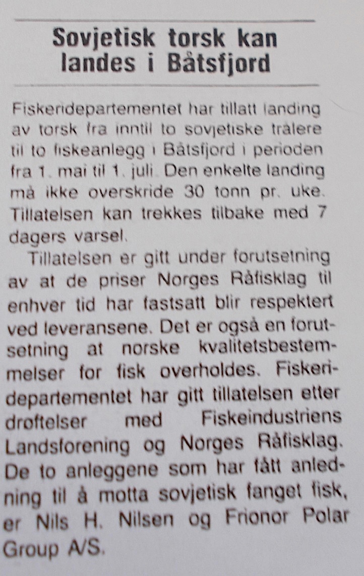 50 år etter at forbudet mot landing av trålfisk ble besluttet av Stortinget, fikk de to første sovjetiske trålerne våren 1988 levere torsk i Båtsfjord. Det mest hellige dogmet var falt, men trålerhatet lever videre. Faksimile fra Fiskets Gang.