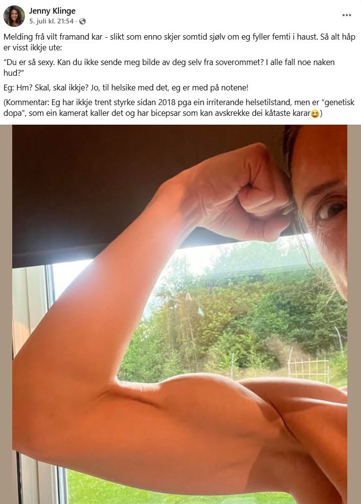 Klinge la lørdag ut et innlegg på sin Facebook-profil hvor hun delte en melding hun hevder å ha mottatt: «Du er så sexy. Kan du ikke sende meg bilde av deg selv fra soverommet? I alle fall noe naken hud?» Hun svarte ironisk på meldingen med et bilde av sin egen biceps, og kommentaren: «Hm? Skal, skal ikkje? Jo, til helsike med det, eg er med på notene!»