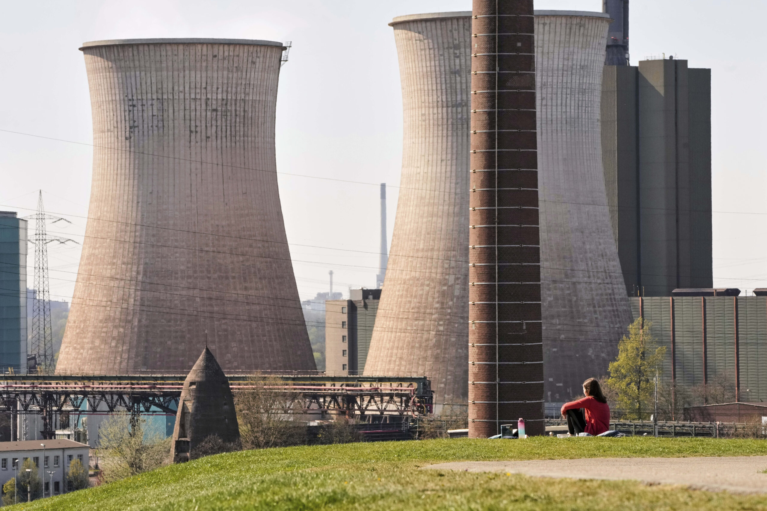 En jente sitter i gresset ikke langt fra gasskraftverket ved Krupp Mannesmanns anlegg for stålproduksjon i Duisburg den 3. april 2025. Foto: Martin Meissner / AP / NTB.