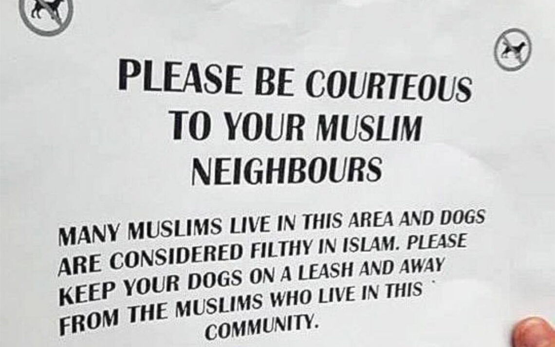 «Det bor mange muslimer i dette området og hunder er ansett som skitne i islam. Vær vennlig å holde hunden i bånd og vekk fra muslimer som bor i dette området.»