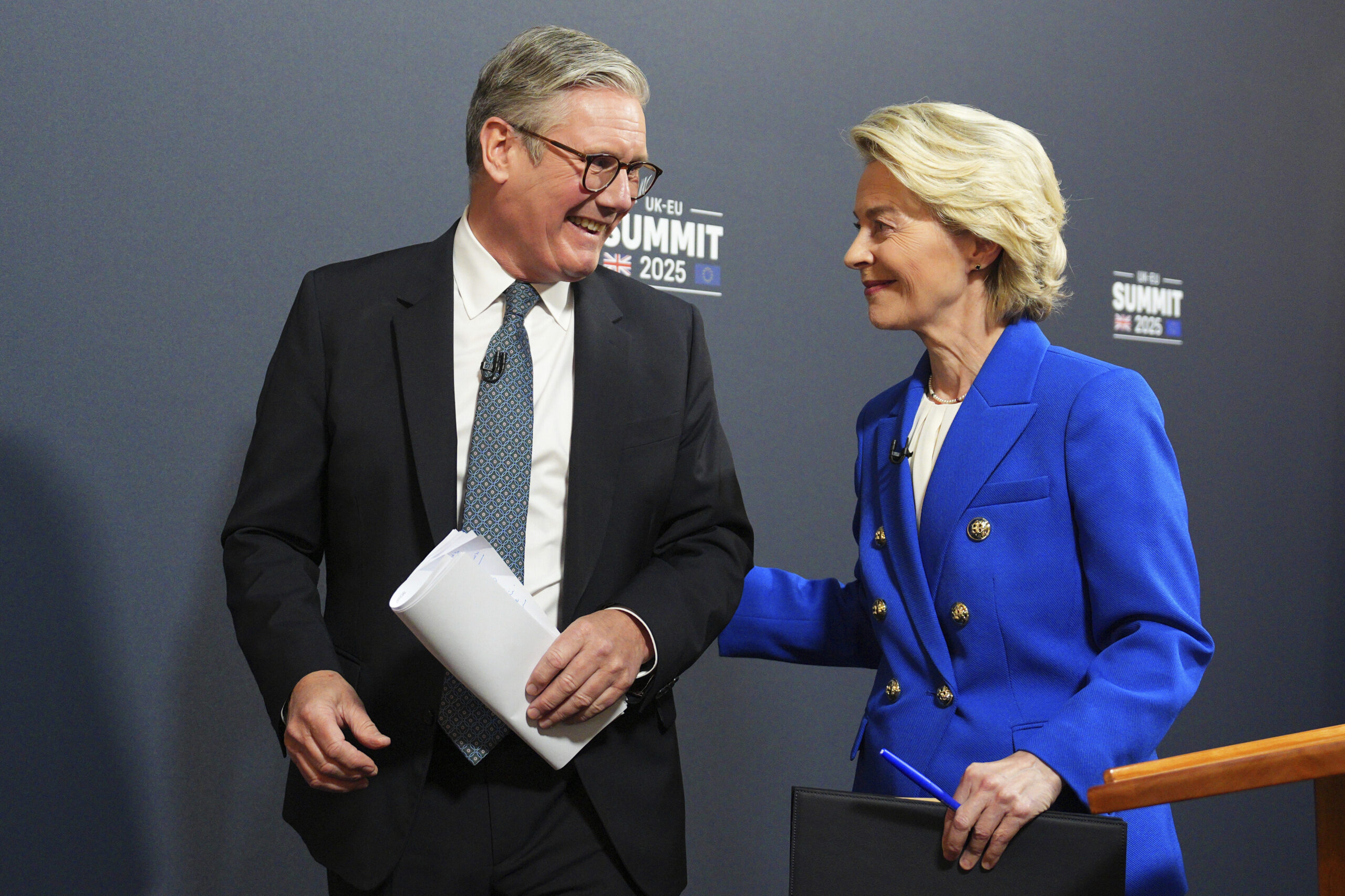 Storbritannas statsminister Keir Starmer og EU-kommisjonens president Ursula von der Leyen smiler etter et toppmøte mellom Storbritannia og EU i London den 19. mai 2025. Foto: Carl Court / Pool via AP / NTB.