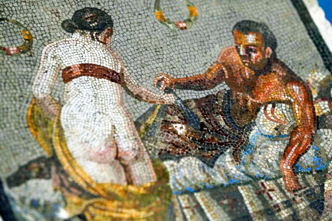 Mosaikken forestiller en halvnaken kvinne som står over sin partner. Den ble stjålet av en nazioffiser under annen verdenskrig, men er nu igjen å se i Pompeii.