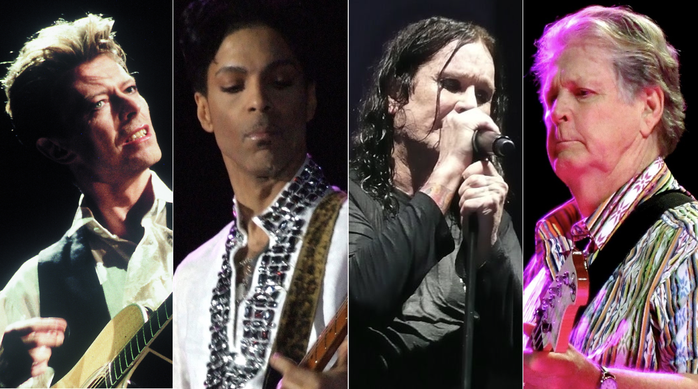 David Bowie (1947–2016), Prince (1958–2016), Ozzy Osbourne (1948–2025) og Brian Wilson (1942–2025). Foto: Les Zg, penner, J-Ham2000, Kyle Overholtze – alle ikoner via Wikimedia Commons (cc by-sa 3.0/4.0)