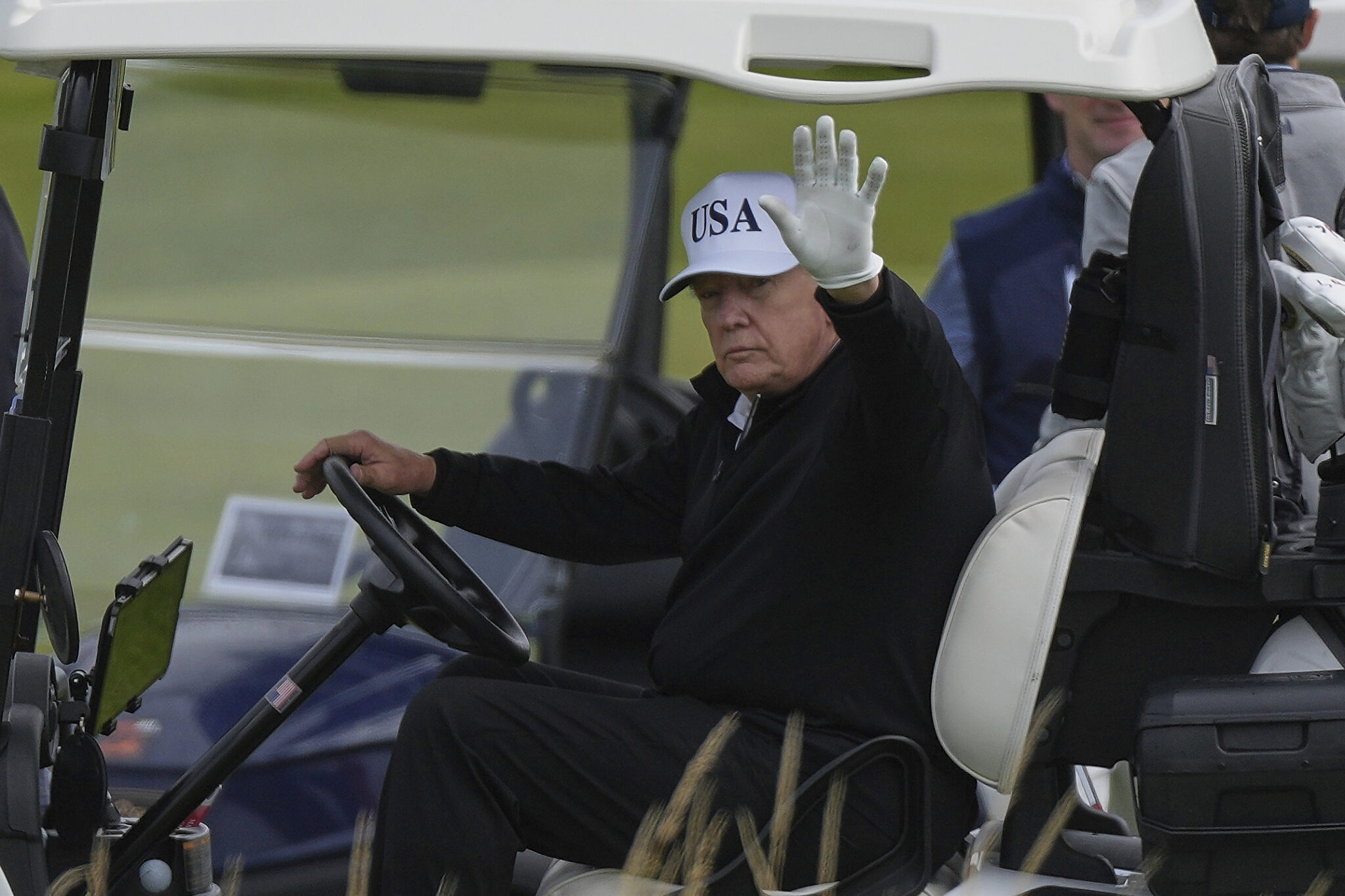 USAs president Donald Trump vinker til journalister mens han sitter i golfbilen sin på Trump Turnberry golfbane i Turnberry i Skottland den 26. juli 2025. Foto: Alastair Grant / AP / NTB.