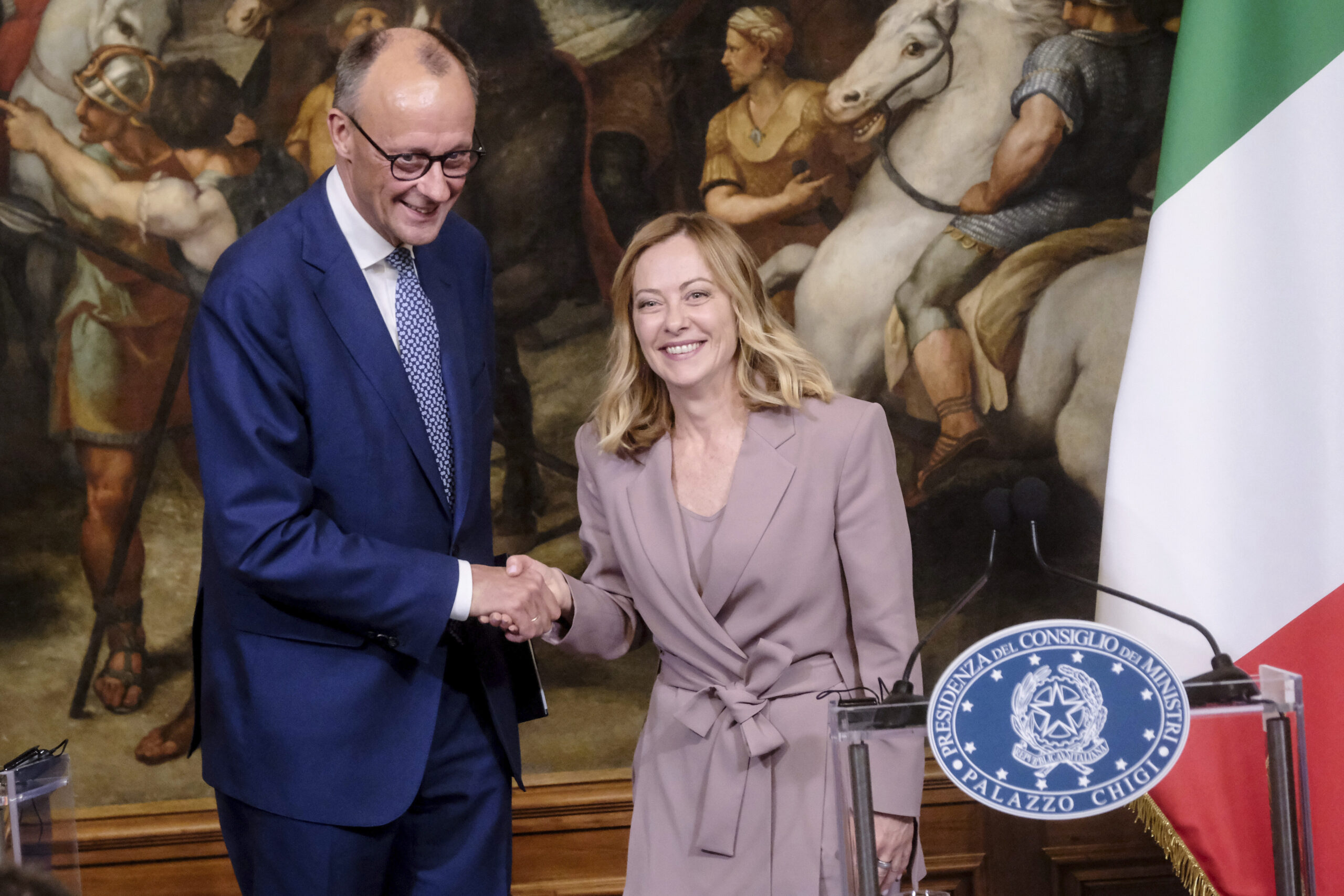 Tysklands statsminister Friedrich Merz hilser på sin italienske kollega Giorgia Meloni under et besøk i Roma den 17. mai 2025. Foto: Mauro Scrobogna / LaPresse via AP / NTB.