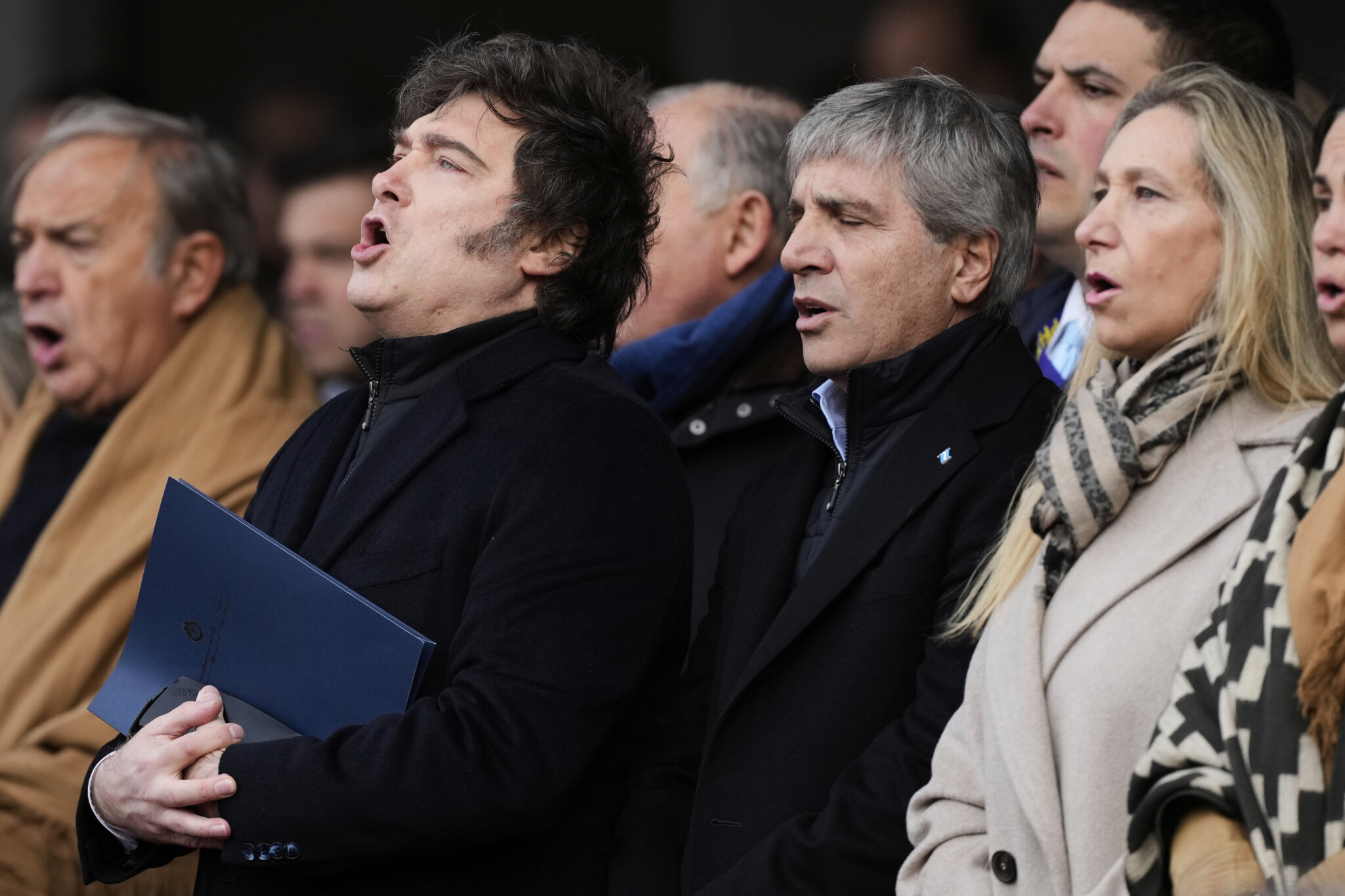 Argentinas president Javier Milei, økonomiminister Luis Caputo og presidentskapets generalsekretær Karina Milei deltar ved åpningsseremonien for jordeierforeningen Sociedad Rural Argentinas årlige utstilling i Buenos Aires den 26. juli 2025. Foto: Gustavo Garello / AP / NTB.