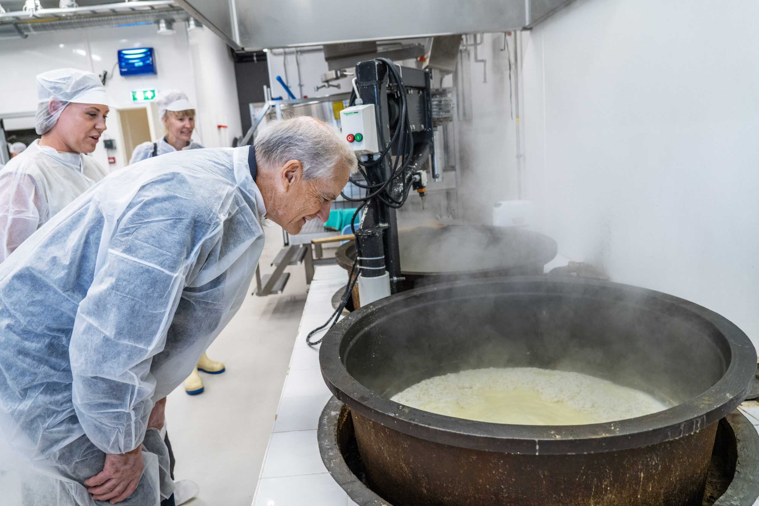 Statsminister Jonas Gahr Støre (Ap) og barne- og familieminister Lene Vågslid besøker Lega ost og bakst i Rauland, der de fikk en omvisning i ysteriet.