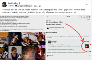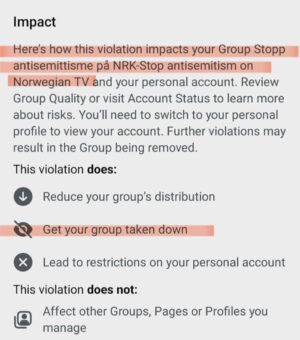 Facebook har fjernet en video publisert i Facebook-gruppen «Stopp antisemittisme på NRK», og varslet at gjentatte brudd kan føre til at gruppen tas ned. I FB-varselet datert 2. august 2025 heter det: