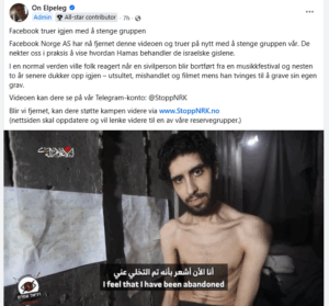 – De norske mediene viser ikke, og kommer heller ikke til å vise, videoer eller bilder av israelske gisler som blir sultet av palestinske terrororganisasjoner i Gaza. Dette er et forsøk på å kneble oss. Det har snart gått et døgn siden videoen ble publisert, og ikke ett eneste sentralt mediehus har delt den. Det er som i Nord-Korea, der man bare viser det som passer regimets agenda, legger han til.