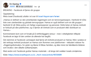 Elpeleg forteller at dette ikke er første gang Facebook fjerner innhold med absurde begrunnelser og truer med å stenge Norges viktigste gruppe i kampen mot mediebias og antisemittisme. – Vi har over 50.000 følgere på Instagram, Twitter og Telegram.