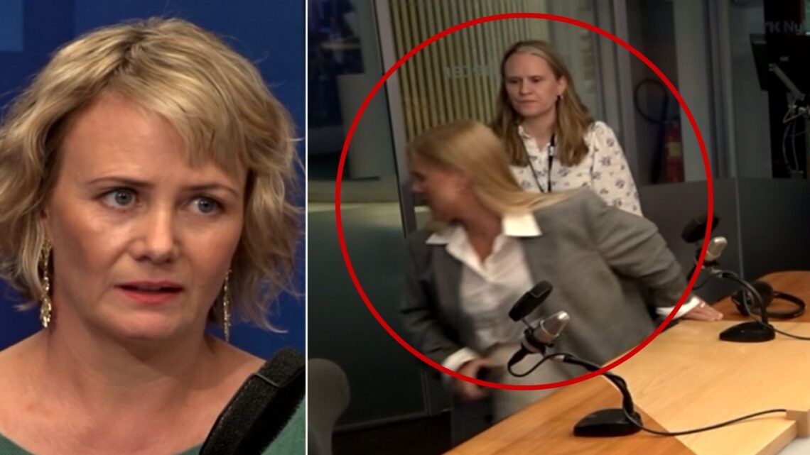 Men etterhvert som sendingen utviklet seg, ble det bare verre. Til slutt måtte hun eskorteres ut av studio. På tampen av sendingen kommer det en NRK-ansatt inn og geileder henne ut mens Sollund sier: