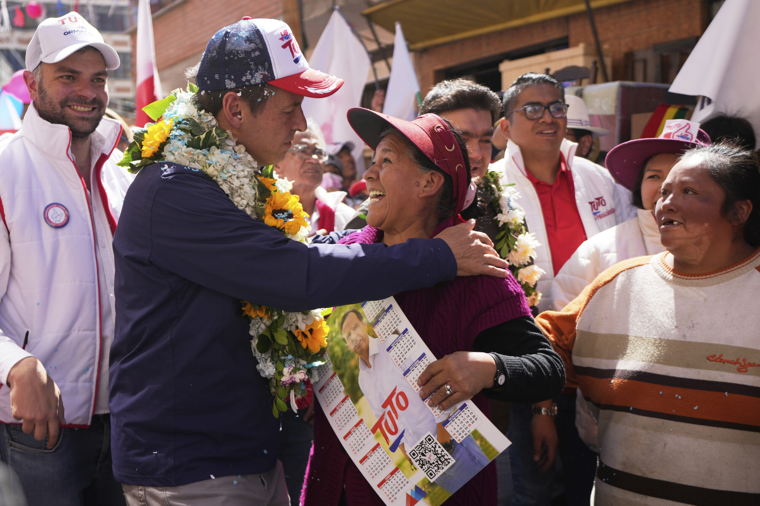 Den bolivianske presidentkandidat Jorge «Tuto» Quiroga hilser på en av sine tilhengere under et valgkamparrangement i La Paz den 7. august 2025. Foto: Juan Karita / AP / NTB,