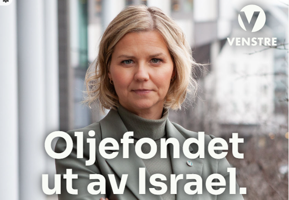 Venstre bruker «Oljefondet ut av Israel» på en av valgplakatene sine.