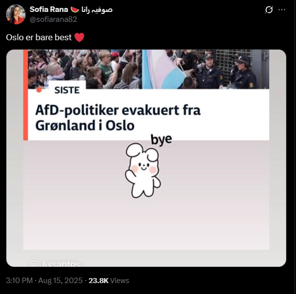 SKRYTEBILDE: Rødt-politiker og Antifa-aktivist Sofia Rana la ut skrytebilde etter at situasjonen ble så truende at AfD-politikeren måtte evakueres, midt i Oslo sentrum.