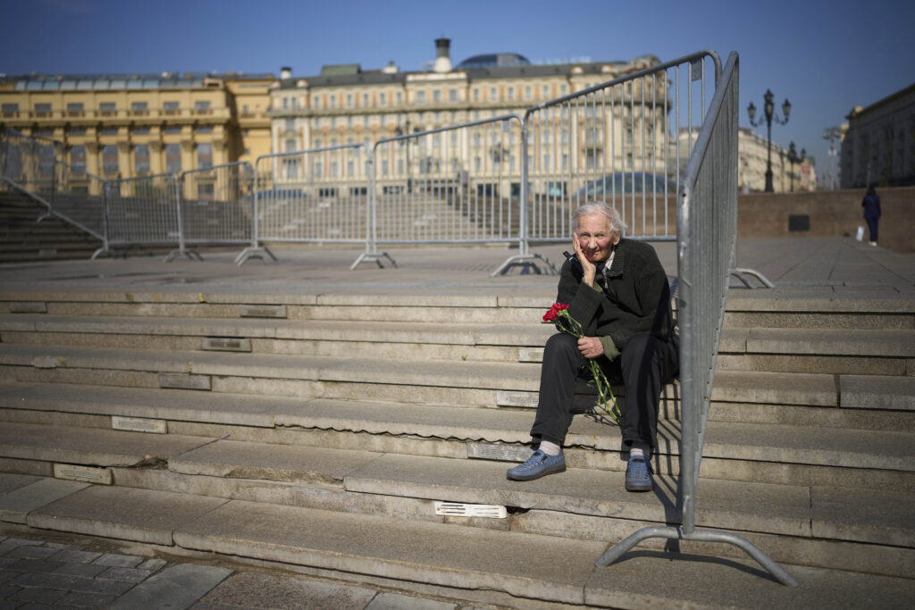 En eldre mann holder noen røde nelliker mens han venter på å legge ned blomster ved mausoleet til Sovjetunionens grunnlegger Vladimir Lenin, nær Den røde plass i Moskva den 22. april 2025, i anledning 155-årsdagen for Lenins fødsel. Foto: Alexander Zemlianichenko / AP / NTB.