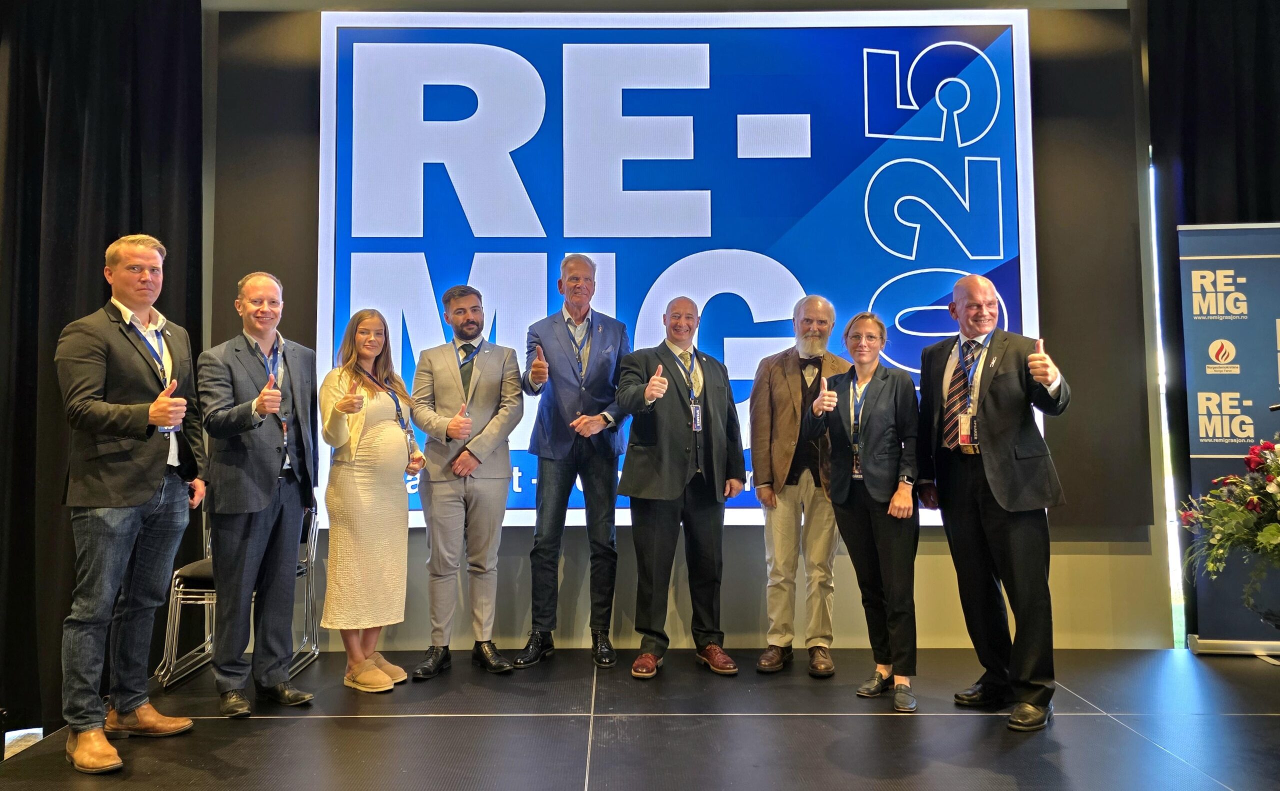 Innlederne under konferansen Remig2025. Fra venstre: Jeff Ahl, grunnlegger av tenketanken Heimr, og tidligere politiker for SD og AfS. Øyvind Eikrem, nestleder i Norgesdemokratene, Rebecca Mistereggen, frilansjournalist, Jordan Crowley, politiker fra irske National Party, Øystein Steiro Sr., listetopp for Norgesdemokratene i Akershus og Vest-Agder, Kenny Smith fra britiske Homeland Party, Renaud Camus, fransk forfatter og filosof, Lena Kotré, advokat og medlem av delstatsparlamentet i Brandenburg i Tyskland for AfD, og Geir Ugland Jacobsen, partileder for Norgesdemokratene. Foto: Bente Haarstad.