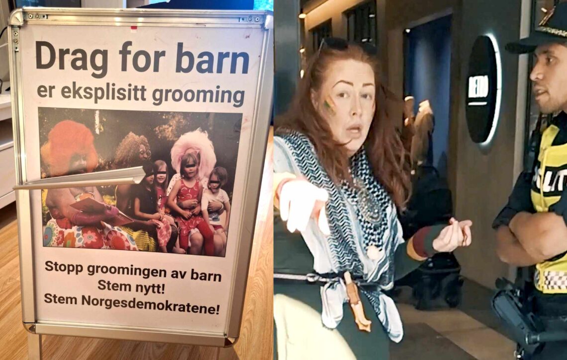 Skiltet som vakte harme hadde et bilde av menn i kvinneklær, som har «kosestund» med barn, og overskriften «Drag for barn er eksplisitt grooming».
