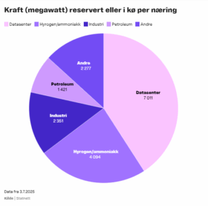 Bransjen etterspør mer strøm enn noen annen bransje i Norge. Slår man sammen hvor mye sentrene har fått reservert eller står i kø for, så tilsvarer det et strømforbruk på inntil 39 prosent av norsk kraftproduksjon.