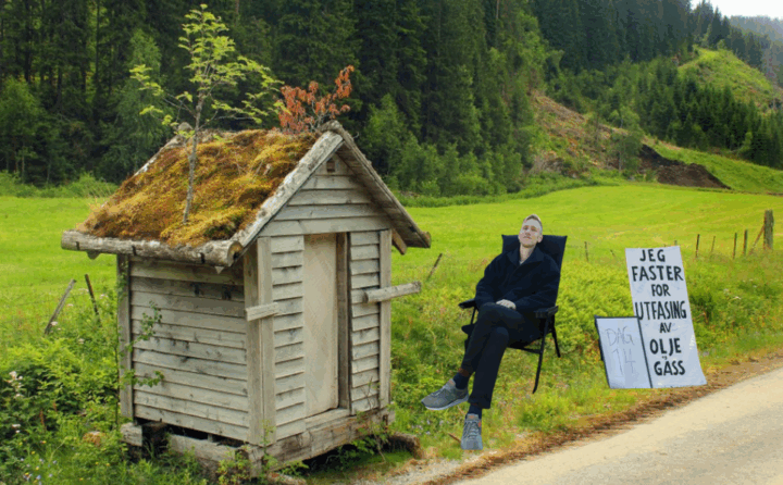 Klimaaktivisten faster foran Stortinget for å få slutt på olje og gass. Men mener han alvor, er det bare én løsning: Han må ta av seg polyesterjakken, rive av seg skoene med gummisåler, kaste madrassen, flasken, teltet, stolene og tusjene, og leve naken i en tømmerkoie uten spiker, med barkebrød til middag og vann fra hule hender. Naken er kanskje too much, så vi lar ham beholde klærne, for å beskytte oss selv.