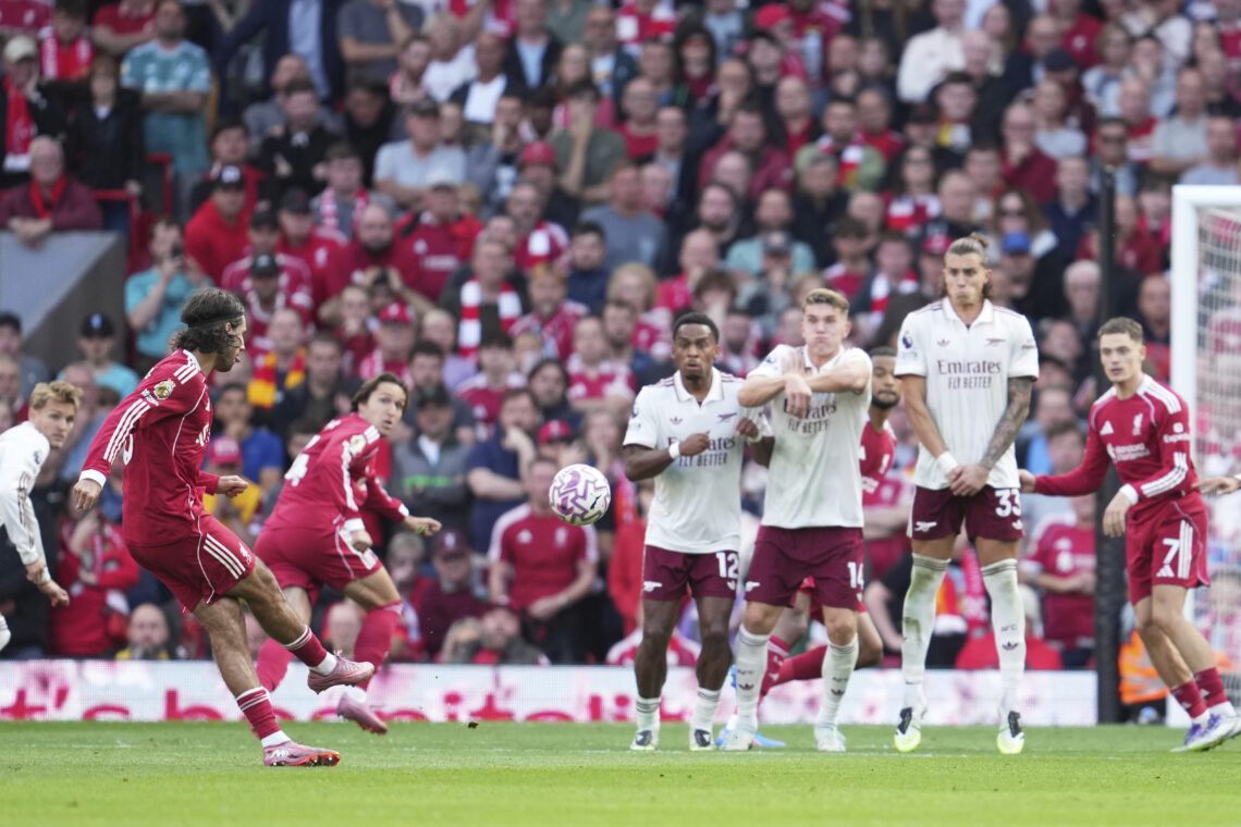 Solen skinner på Anfield, alt tyder på en flott kamp. Liverpool starter best, og Arsenal er uheldige, ettersom de må bytte ut den glimrende midtstopperen Saliba på grunn av skade etter noen minutter.