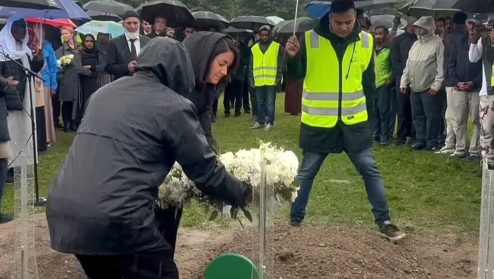 Arbeids- og inkluderingsminister Tonje Brenna la ned krans i begravelsen til Tamima Nibras Juhar 29. august 2025. Kan vi regne med at kransen var fra regjeringen, og ikke fra henne personlig? Foto: Facebook.