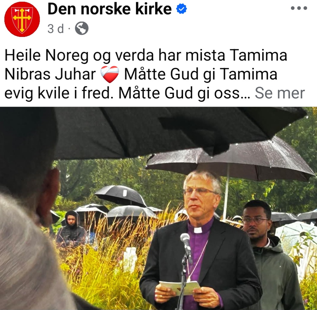 Mange prominente deltok i den islamske begravelsen til Tamima Nibras Juhar. Her taler biskopenes preses, Olav Fykse Tveit. Mohammed Abdullahi i Islamsk Råd Norge holder paraplyen. Han var tidligere ansatt i Sør-Trøndelag politidistrikt og var også en som sørget for at Rema-kyllingen fikk halalsertifisering. Foto: DNK/Facebook.