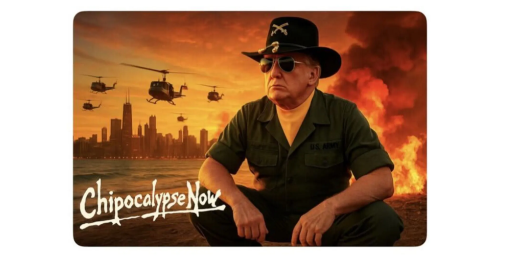 I bakgrunnen ser man militære helikoptere og flammer foran Chicago. Trump ønsker å sette inn Nasjonalgarden i byen for å sørge for borgernes trygghet, på lignende måte som han har gjort i Los Angeles og Washington D.C.