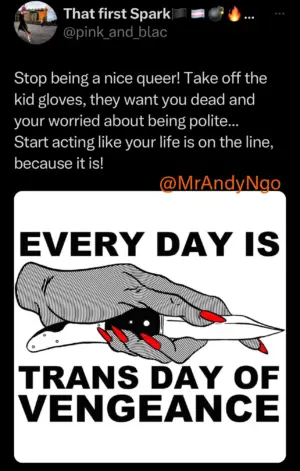 Andy Ngo beskriver transideologiens militante karakter som drevet av propaganda som fremstiller samfunnet som ansvarlig for et transfolkemord, og oppfordrer til hevn mot cis-personer, kristne og konservative.