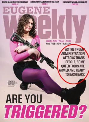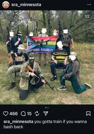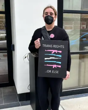 Transpersonen Robert Westman i Minneapolis hadde et klistremerke av samme bilde som flagget til Socialist Rifle Association på sitt manifest. Et populært skilt og budskap brukt av transaktivister.