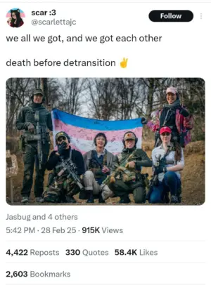 Samtidig har ytterliggående venstreorienterte og Antifa-nettverk over hele USA åpent oppfordret transaktivister til å hamstre skytevåpen og gjennomgå paramilitær trening, med det eksplisitte målet å drepe såkalte transfober og fascister.