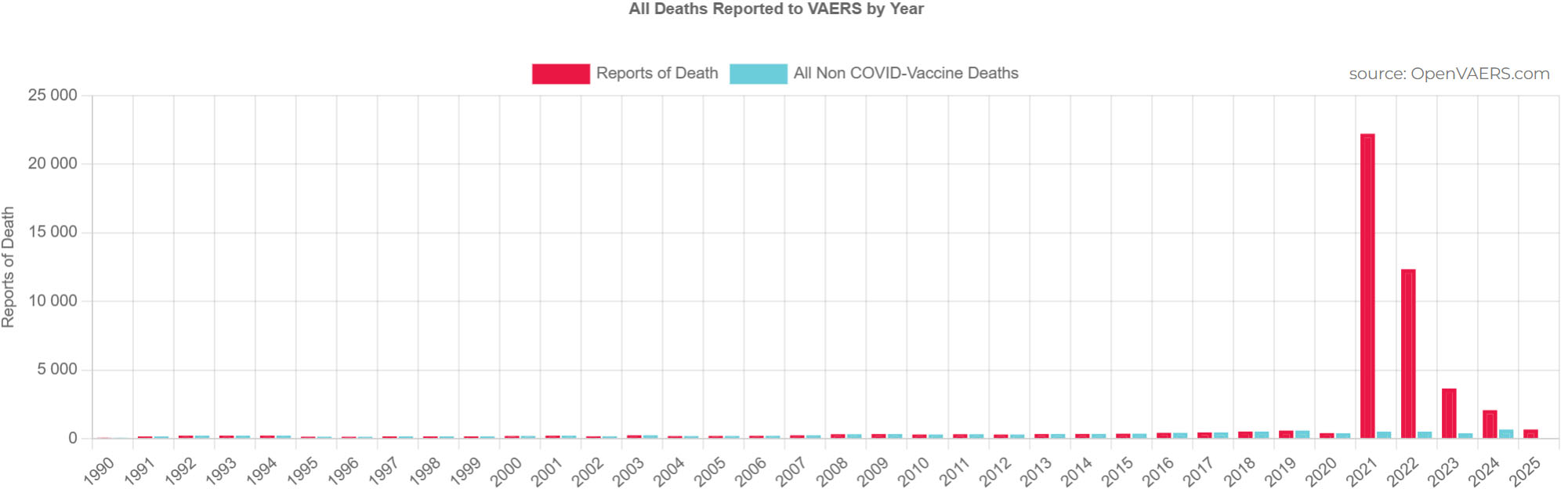 Abraham støtter seg på VAERS-data som viser høyere rapporterte dødsfall efter covid-vaksiner enn alle andre vaksiner siden 1990.