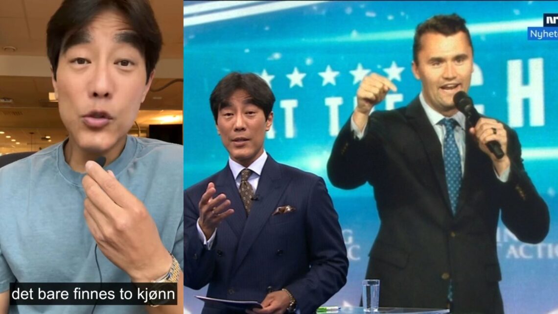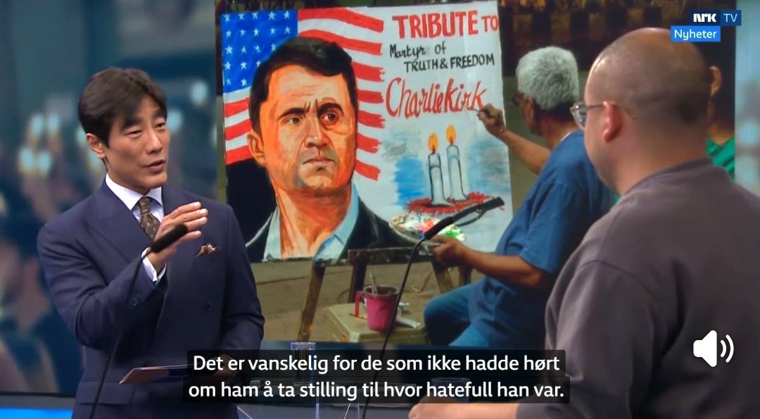 – Det er vanskelig for dem som ikke hadde hørt om ham å ta stilling til hvor hatefull han (Kirk) var. Programleder Fredrik Solvang synes noe enig med Gabriel Correa, som var gjest i Debatten. Det er vanskelig å vite hvilken relevans Correa hadde til temaet, men vi fikk vite at han nettopp hadde blitt norsk statsborger, og noterer at Solvang ikke avbrøt ham da Correa mente at Charlie Kirk nærmest var et resultat av Ku Klux Klan. Skjermbilde fra NRK.