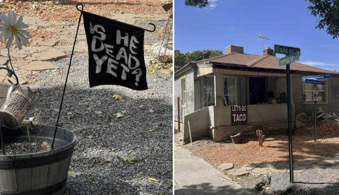 Dette er huset de bor i, som vises i Fox News-videoen over, og i ABC4 News. Flagget «er han død ennå», antas er rettet mot Trump.