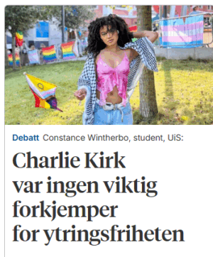 Kirk var en ekstremist og angivelig en rasist, som fremmet farlige ideer som ledet til at mennesker som Tamima blir drept, hevder psykologistudenten. Som om Kirk hadde noen skyld i drapet på Tamina? Drapet ble begått av en psykisk syk serber som aldri burde vært på en norsk helseinstitusjon.