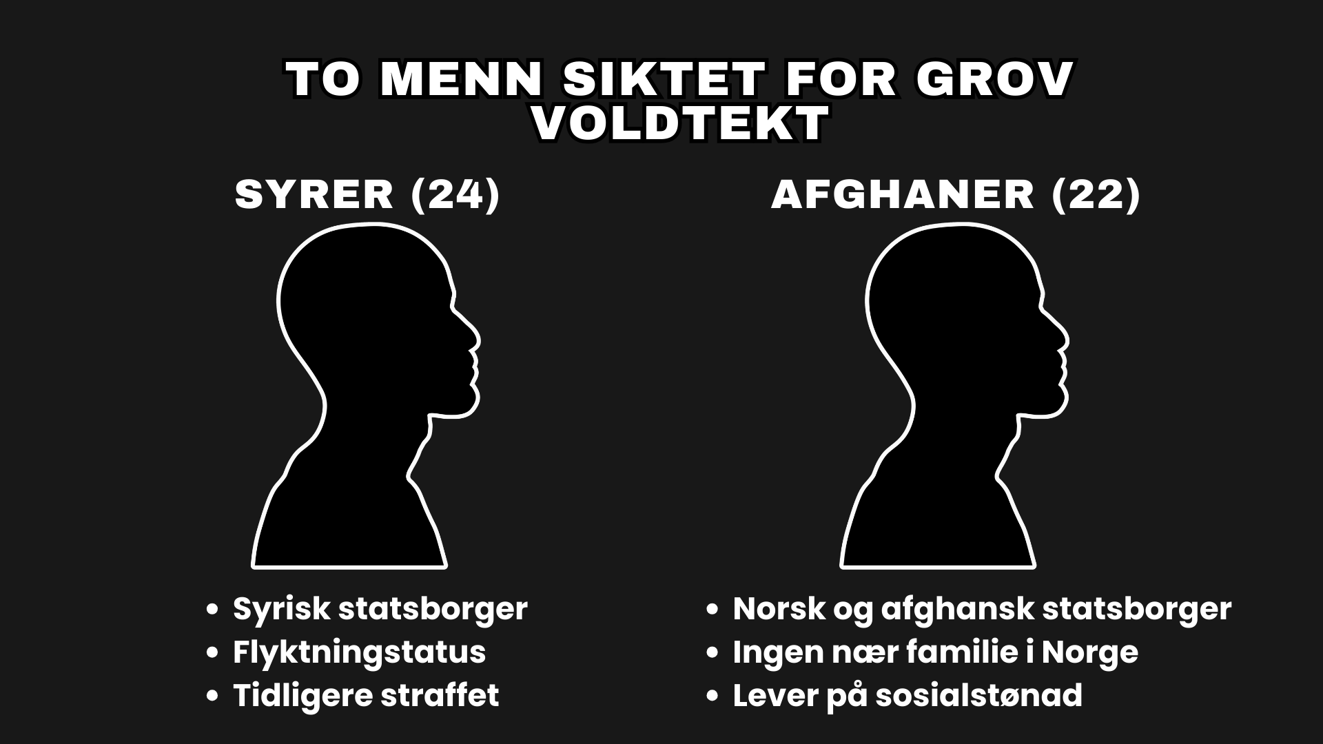 En syrisk mann på 24 år og en afghaner på 23 er siktet for en grov voldtekt av en kvinne som var på vei hjem fra byen. Begge har en «skjør» tilknytning til Norge, ifølge tingretten.