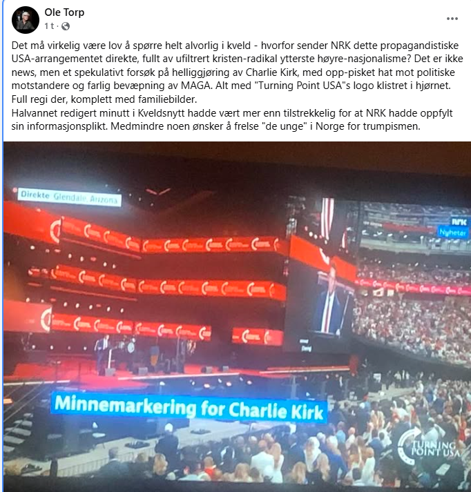 – Det må virkelig være lov å spørre helt alvorlig i kveld – hvorfor sender NRK dette propagandistiske USA-arrangementet direkte, fullt av ufiltrert kristen-radikal ytterste høyre-nasjonalisme? Det er ikke news, men et spekulativt forsøk på helliggjøring av Charlie Kirk, med opp-pisket hat mot politiske motstandere og farlig bevæpning av MAGA. Alt med «Turning Point USA»s logo klistret i hjørnet. Full regi der, komplett med familiebilder. Halvannet redigert minutt i Kveldsnytt hadde vært mer enn tilstrekkelig for at NRK hadde oppfylt sin informasjonsplikt. Medmindre noen ønsker å frelse «de unge» i Norge for trumpismen.