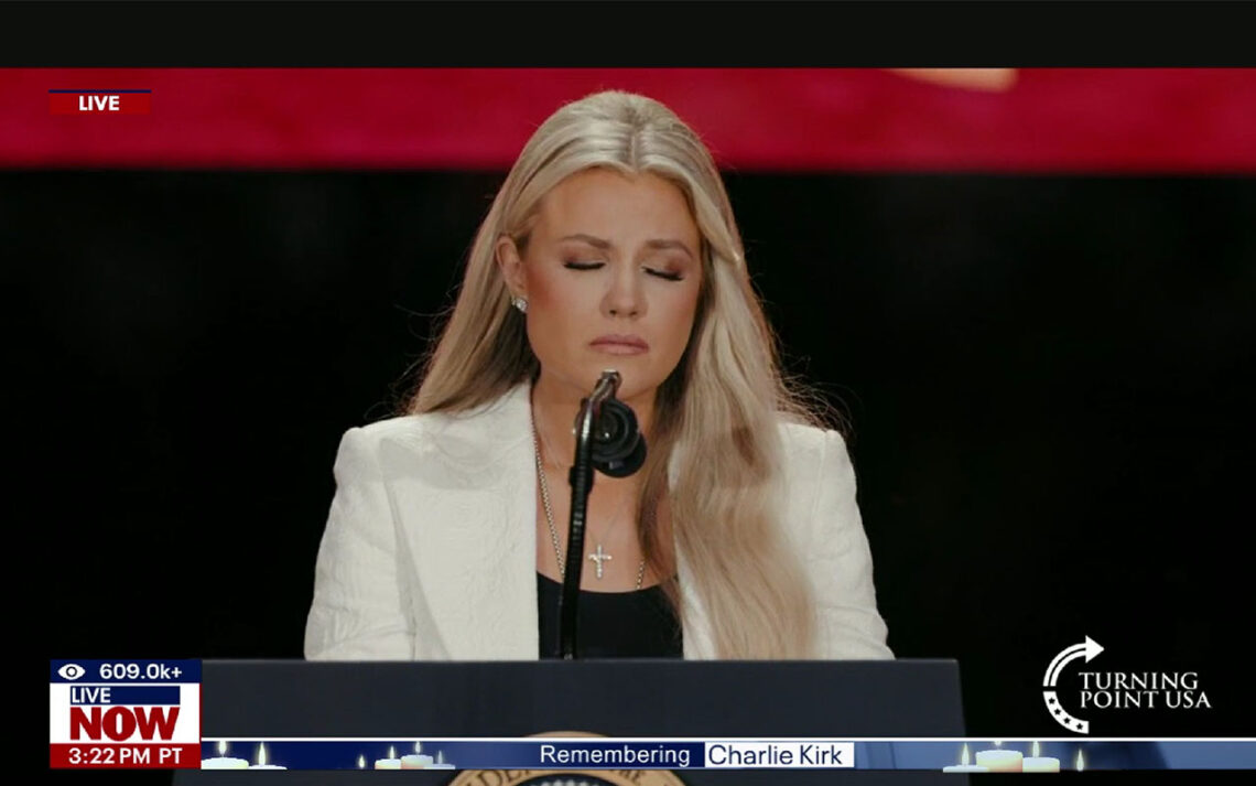 Erika Kirk var iført sort kjole og hvit jakke. Rundt halsen bar hun korset. Hennes tale var preget av kjærlighet til sin avdøde ektemann, sorg og gudstro. Hun uttrykte takknemlighet for Kirks arv, men det som fanget mest oppmerksomhet var at hun siterte Lukas 23,34, Jesu ord på korset, og ga morderen, Tyler Robinson, sin tilgivelse: