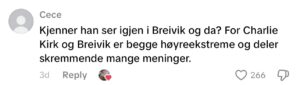 – Kjenner han [Choi] seg igjen i Breivik òg, da? For Charlie Kirk og Breivik er begge høyreekstreme og deler skremmende mange meninger, skriver brukeren Cece i en annen kommentar Olsen har trykket liker på.