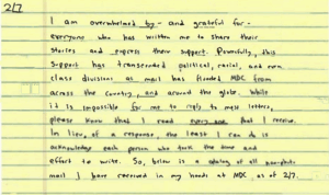 – Jeg er overveldet av – og takknemlig for – alle som har skrevet og fortalt sine historier til meg og uttrykt støtte. Denne støtten har på en kraftfull måte overskredet politiske, rasemessige og til og med klasseskiller, MDC [Metropolitan Detention Center] har blitt oversvømt av post fra hele landet og resten av verden. Selv om det er umulig for meg å svare på de fleste brevene, må dere vite at jeg leser alle jeg mottar. Tusen takk til alle som har brukt tid på å skrive til meg. Jeg ser frem til å høre mer i fremtiden.