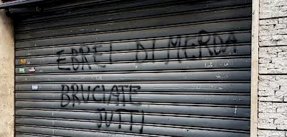 Om morgenen søndag 5. oktober 2025 var rulleskoddene foran inngangen til et kosher-bakeri i Roma-bydelen Marconi blitt tilgriset av påmalte slagord med ønske om at alle «møkkajøder» skal brenne. To år med konstant antisemittisk propaganda og masseopptog til støtte for Hamas har sin virkning. Stilbilde: AGTW / YouTube.