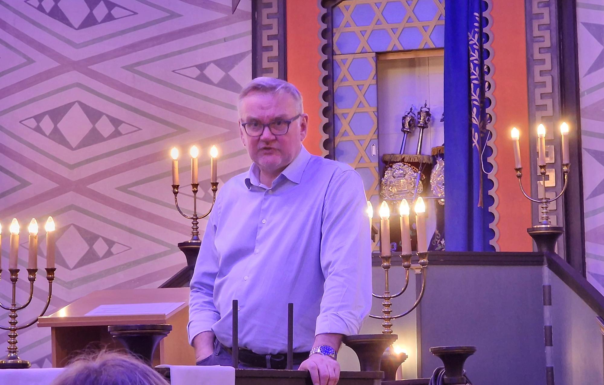 – I Trondheim hadde vi åpent samfunnshus for medlemmene, slik at alle som hadde behov for og ønske om det, kunne være sammen, sier John Arne Moen, leder for Det jødiske samfunn i Trondheim. Her fra en annen anledning og omvisning i synagogen i Trondheim, som er en av verden nordligste. Foto: Bente Haarstad.