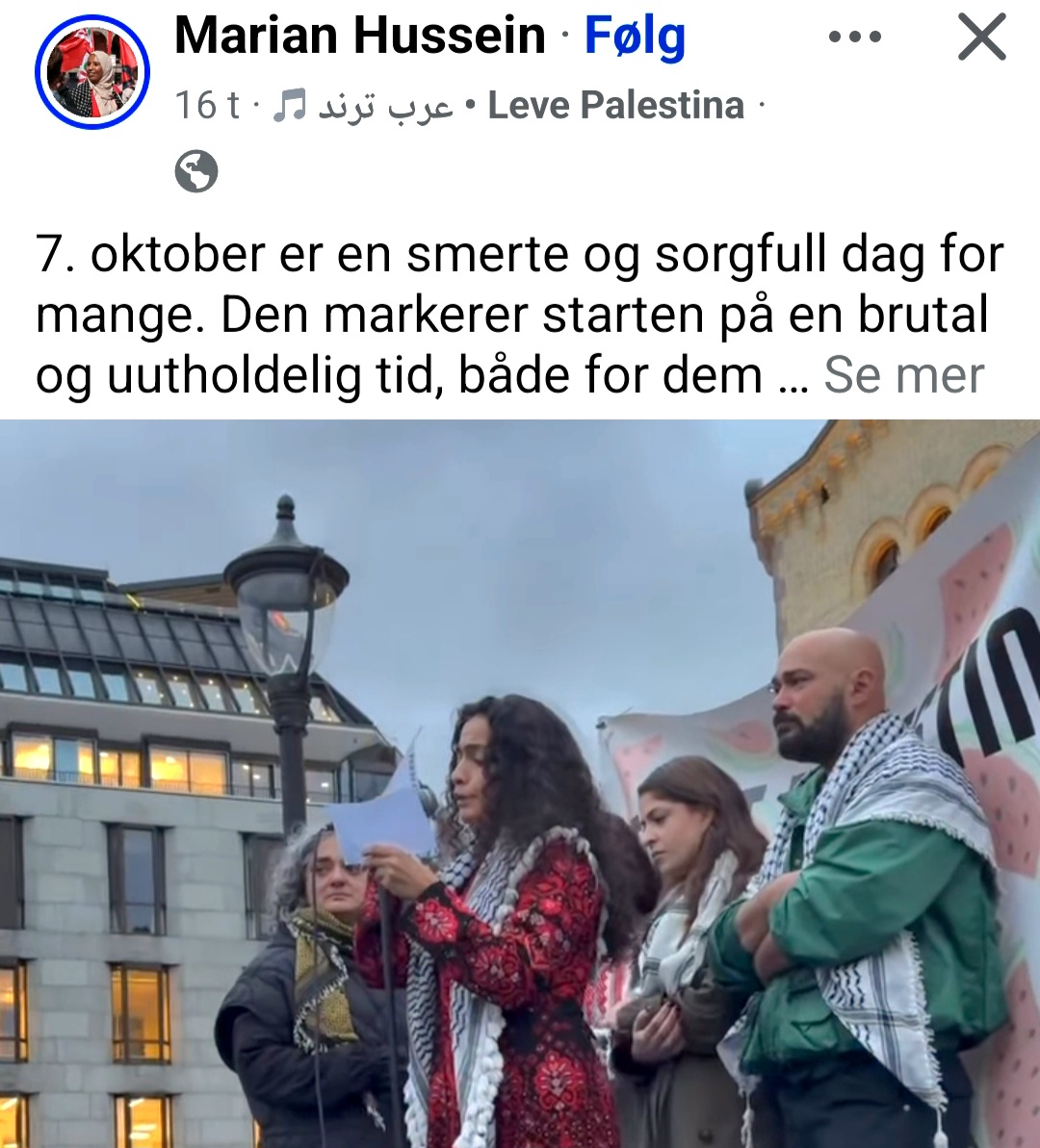Utallige kjendiser har postet om 7. oktober på Facebook, om at det var araberne som var de lidende den dagen for to år siden. Som Marian Hussein, opprinnelig fra Somalia, men nå nestleder for SV, og muslimsk stortingsrepresentant iført hijab. Hun sneier riktignok borti at det ble noen israelere drept den dagen, men har ikke akkurat helt kontroll på fakta.