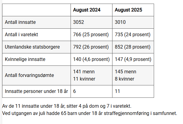 Soningskøen har også økt betydelig fra 2024 til 2025, med 235 som ventet på å gjenomføre soning i august 2024, mot 379 i august 2025.
