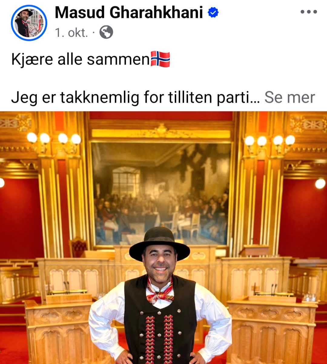 Masud Gharahkhani er aktiv i sosiale medier ved å fortelle hva han bedriver, i ord og bilder. Så han la også ut en post på Facebook da det 1. oktober ble klart at Arbeiderpartiet ønsket at han skulle fortsette som stortingspresident. På politiker-siden (han har flere), som han kaller masudpolitican.