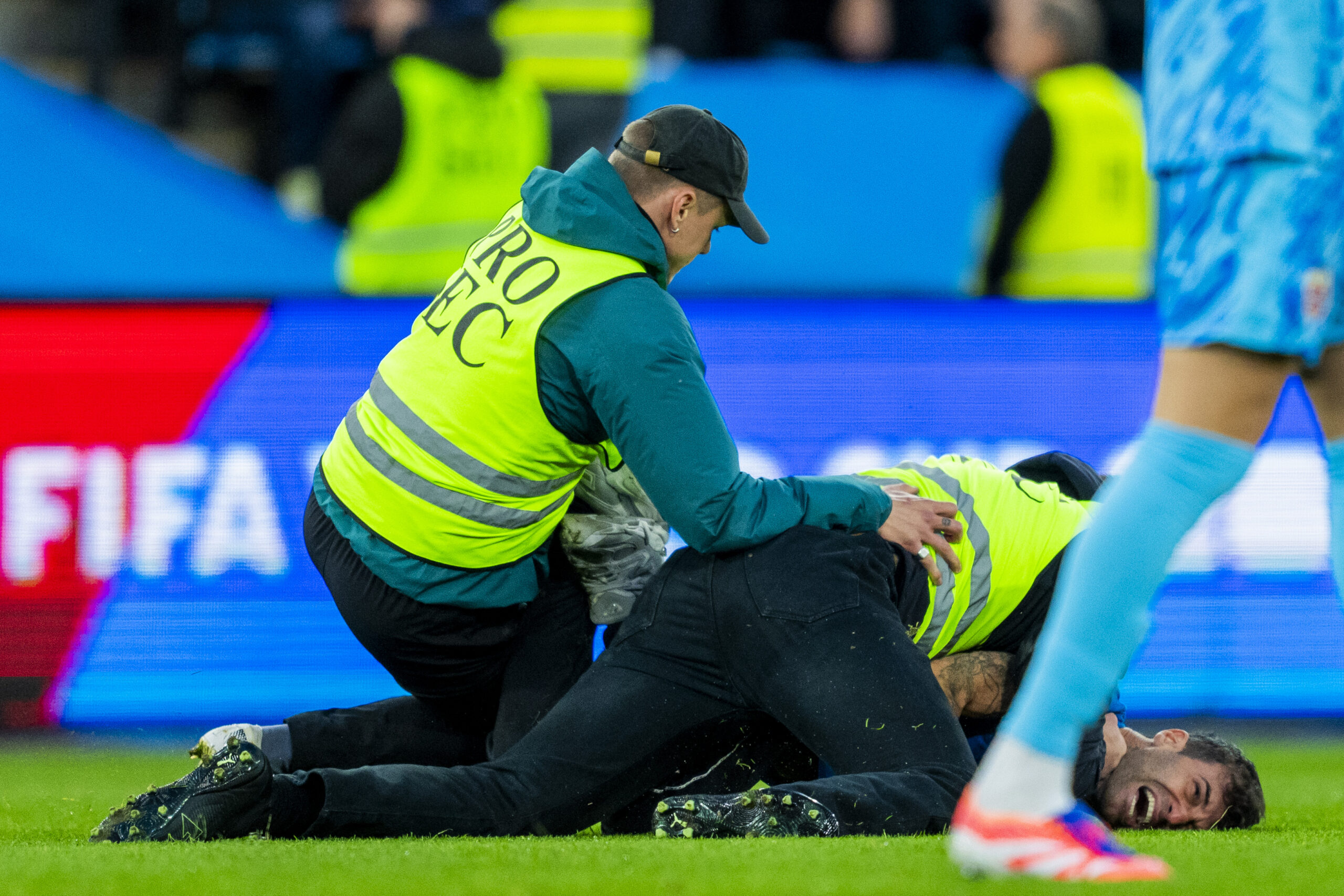 En banestormer blir tatt hånd om av sikkerhetsvakter under VM-kvalifiseringskampen i fotball mellom Norge og Israel på Ullevaal Stadion.